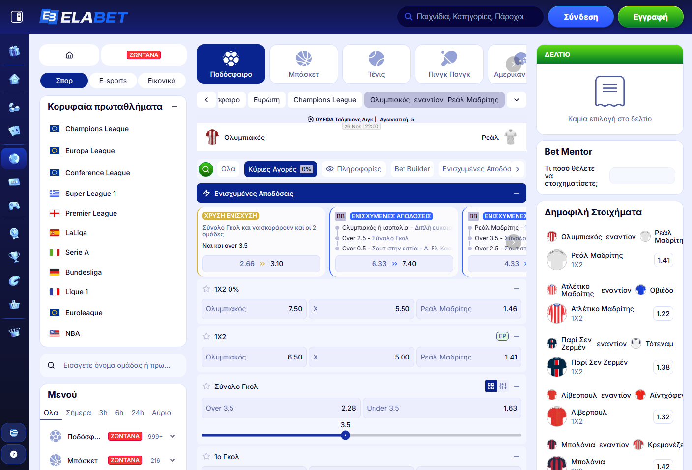 | Πρόσθετες λειτουργίες / εργαλεία | Bet-Builder (δημιουργία δελτίων με πολλαπλά σημεία), Cash-Out (μέρος ή όλο), VIP πρόγραμμα, πιθανές προσφορές/μπόνους. |