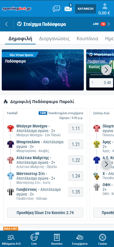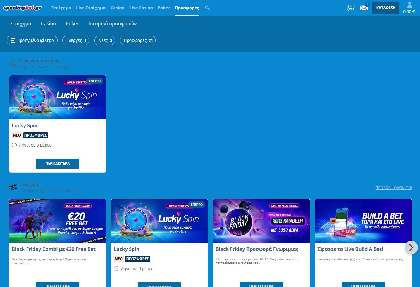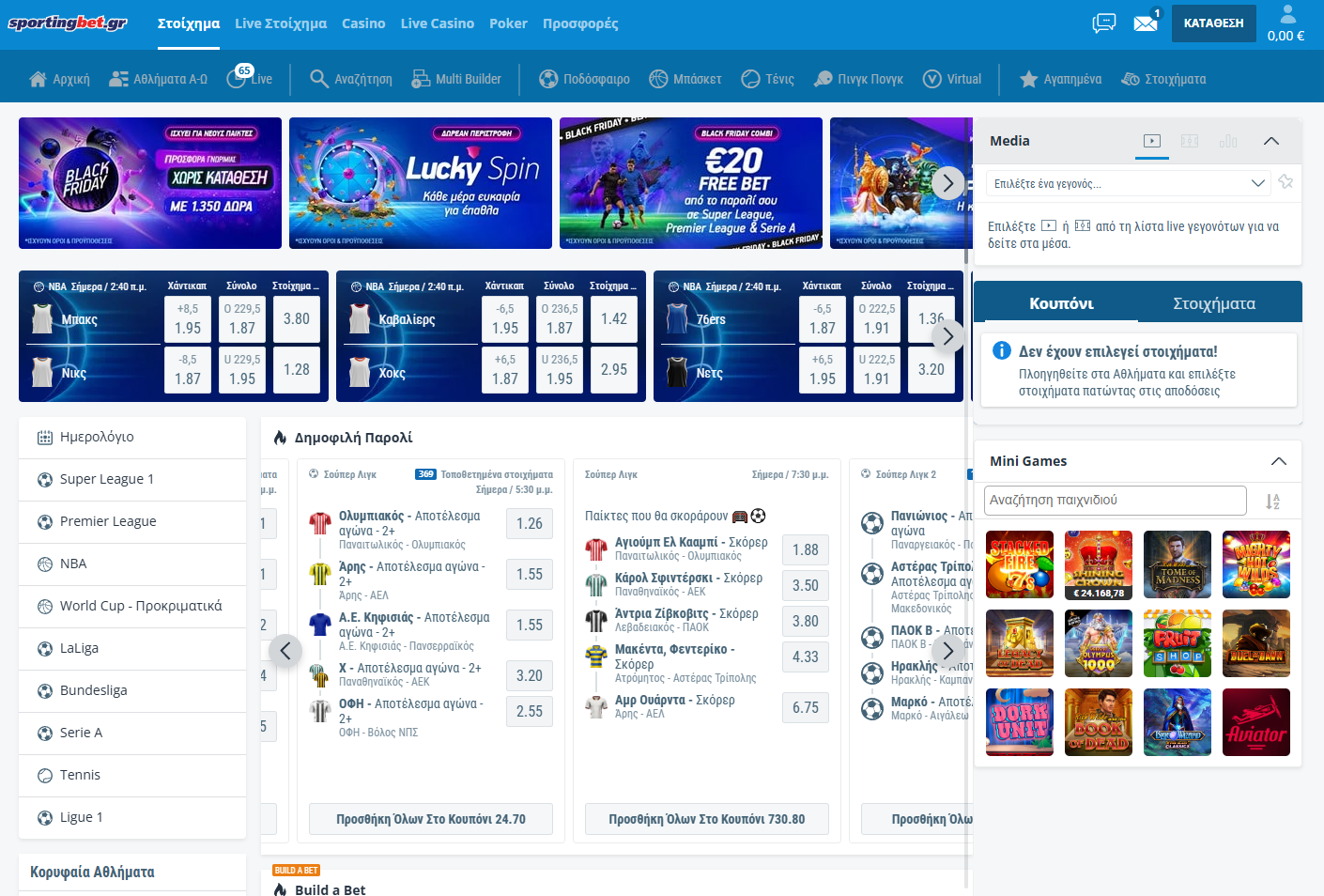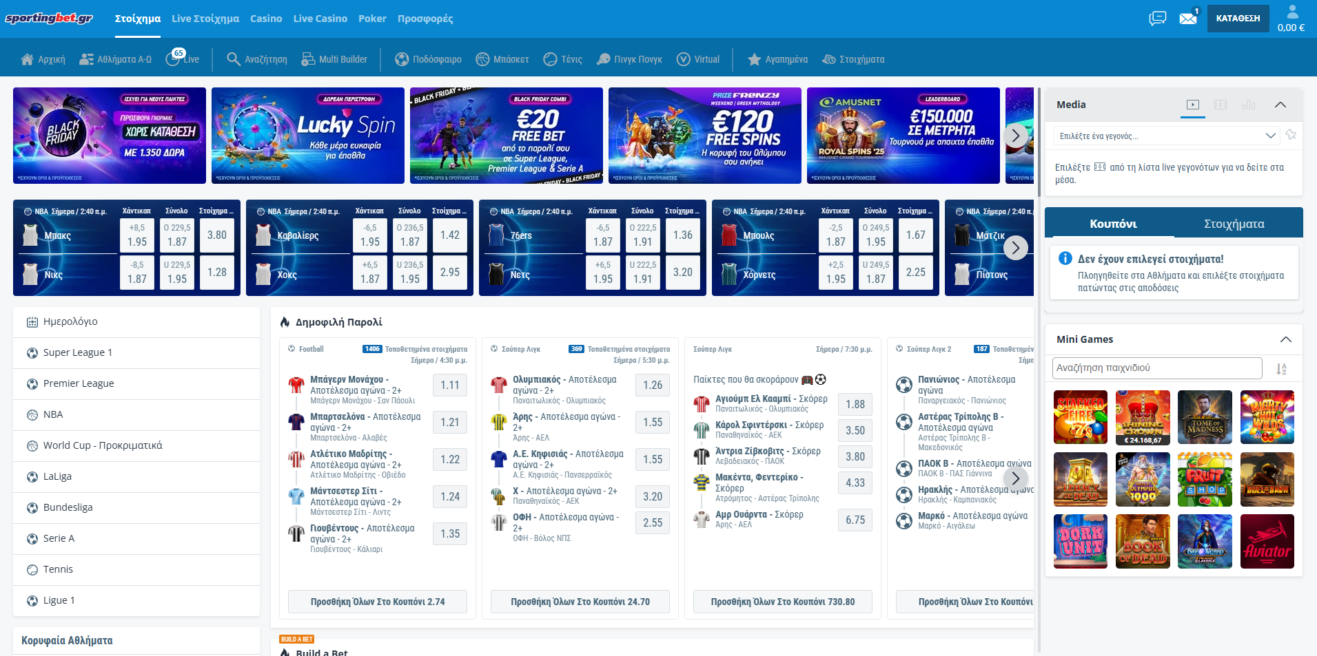 • Αθλητικό στοίχημα (Sports Betting) — pre-match αλλά και live στοίχημα σε μεγάλο πλήθος αθλημάτων και αγορών.