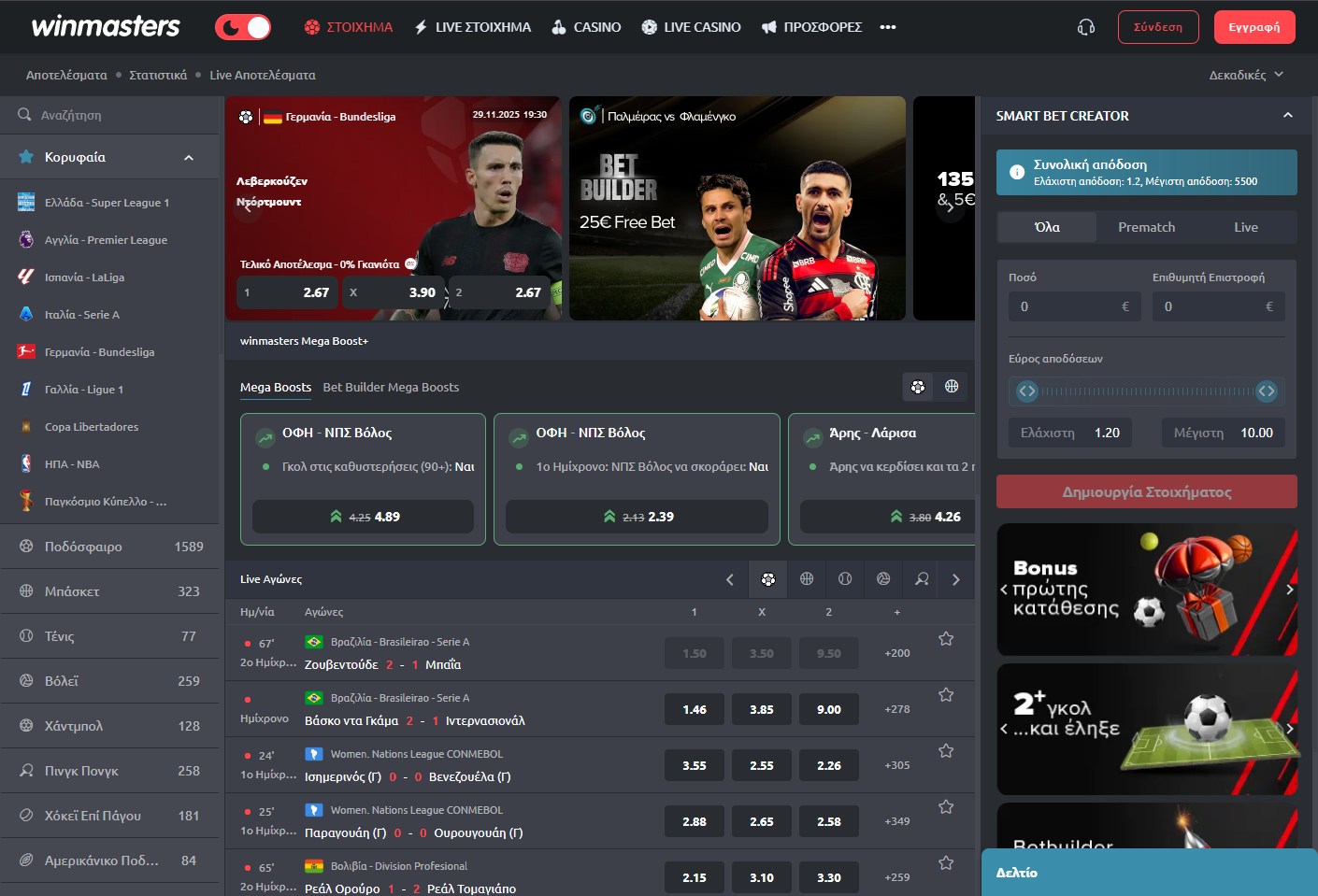 Αθλητικό στοίχημα (sports betting) — pre-match και live / in-play στοιχήματα σε ποικιλία αθλημάτων.