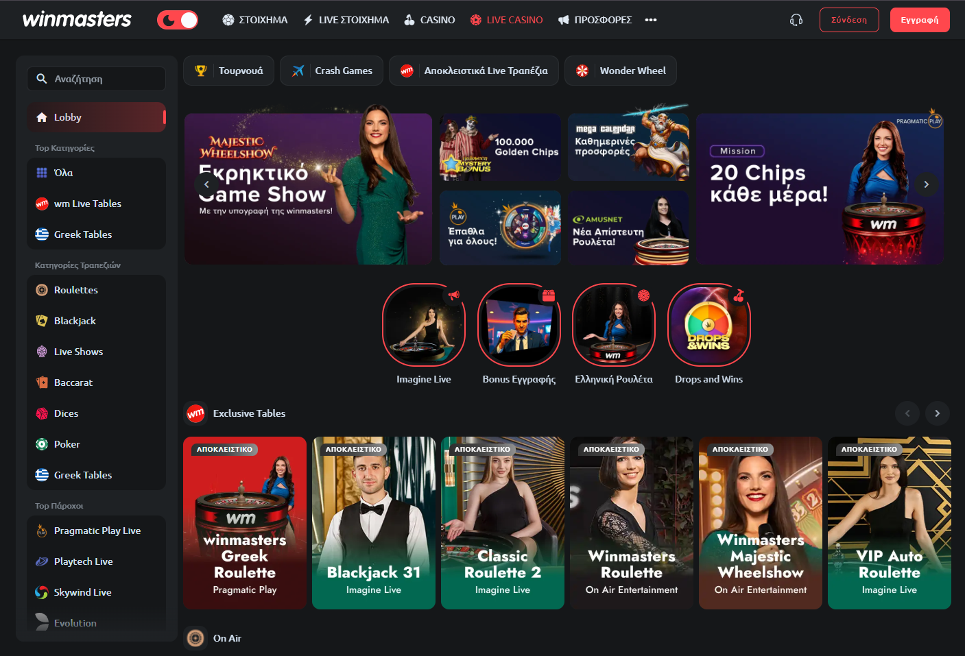 Live Casino — παιχνίδια με πραγματικούς dealers (ρουλέτα, μπλακτζάκ, πόκερ, κ.λπ.) μέσω streaming.